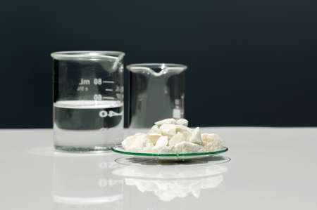 Calcium carbonate Chip in Chemical Watch Glass place next to crystal clear liquid in Beaker. Closeup chemical ingredient on white laboratory table. Side View