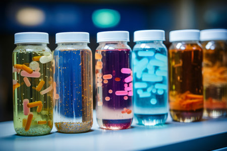 A series of glass jars filled with liquids of varying colors sit on a laboratory bench, showcasing diverse textures and shades ideal for scientific examination and analysis.