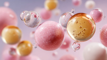 Cosmetic ingredients levitating in transparent spheres: peptides, hyaluronic acid, natural oils, suspended in pastel mist.