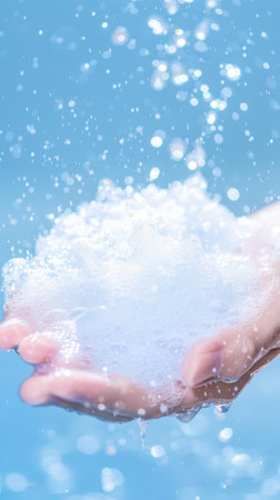Close up of a hand holding foamy bubbles against a sparkling blue background in sunlight.