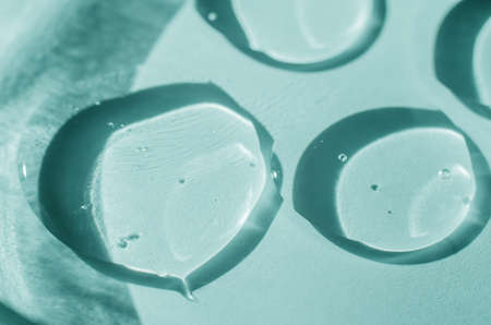 Cosmetic gel, serum swatches. Gel texture. Clear cosmetic liquid drop. Transparent skincare product with bubbles sample. Close up.