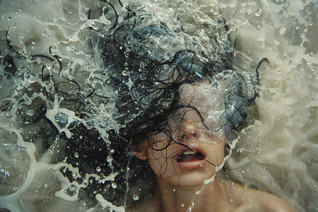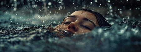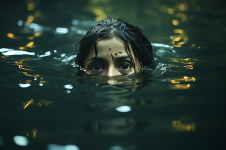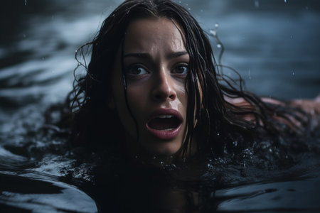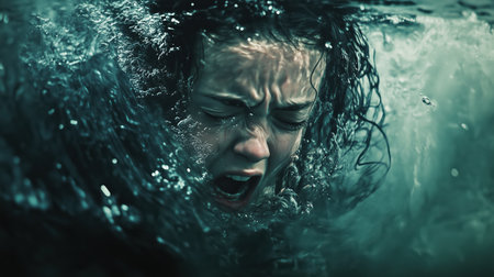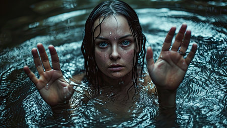 Young Woman, Dark Water, Fear A portrait of terror and survival as a woman battles the depths.