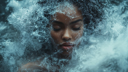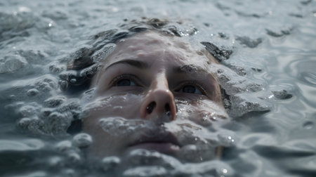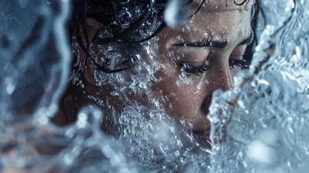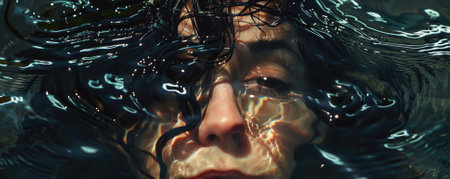 A mesmerizing underwater shot revealing a face surrounded by liquid, creating an ethereal atmosphere. The interplay of light and water enhances the emotional depth.