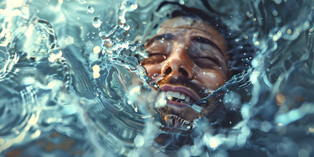 man is coming up out of the water while smiling background - Ai Generated