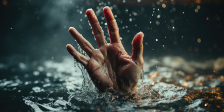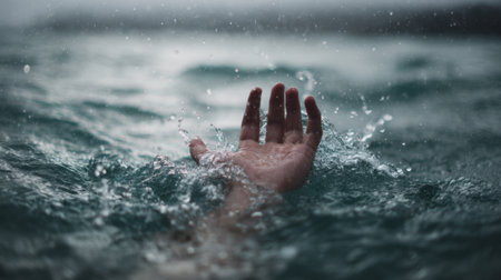 A hand emerges from turbulent water surrounded by splashing waves. The scene captures a moment of urgency and desperation highlighting the struggle against the storm's power.