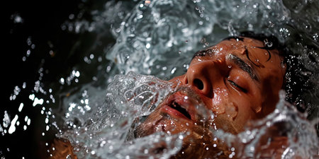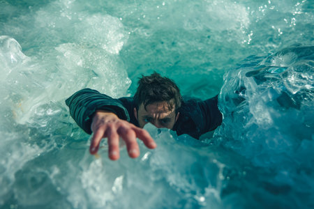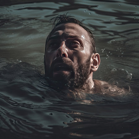A dramatic portrayal of a man submerged just below the water's surface, his face showing a desperate expression for the air.