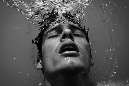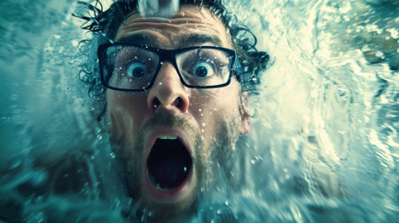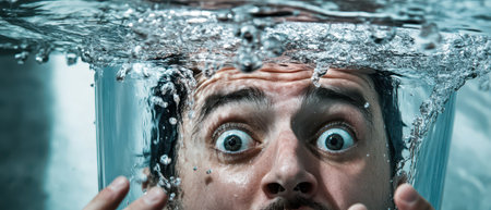 A man with wide eyes appears startled while submerged in water creating bubbles and splashes around him highlighting his expression of surprise.