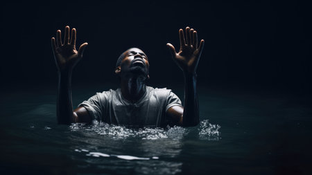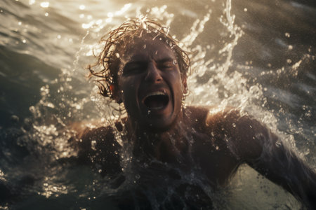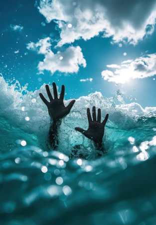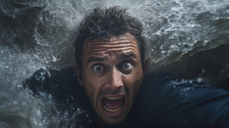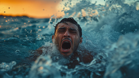 The concept of tragedy takes a poignant form in this image, where a man's scream desperate pierces through the splashing waves as he struggles against drowning in the sea.