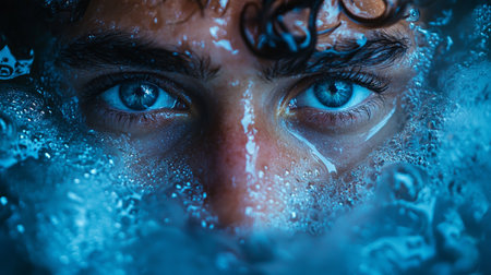 A captivating close-up portrait of a man submerged underwater, with glowing blue eyes reflecting the light, creating an intense and artistic composition.