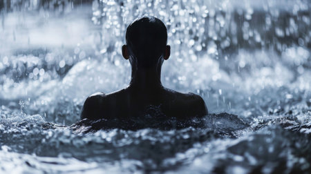 Man immersing in icy water on winter rainy day. Frozen spirit of extreme day time. Generate Ai