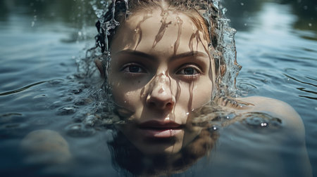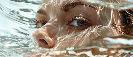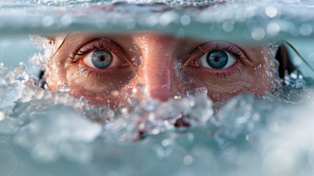 A striking close-up of a young womans eyes breaking the waters surface, capturing a serene and mesmerizing moment filled with emotion.