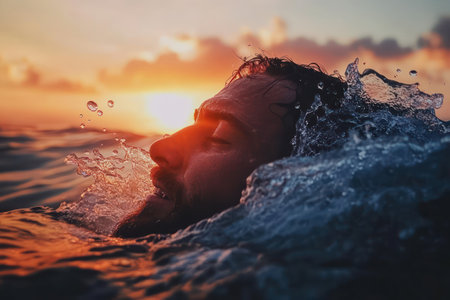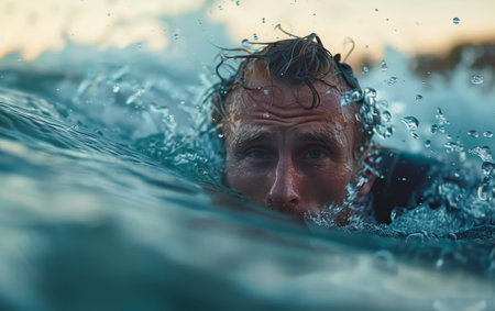 An adult swimmer peers through the ocean waves at sunset, connecting with the viewer. The calmness of the sea complements the intensity in his eyes