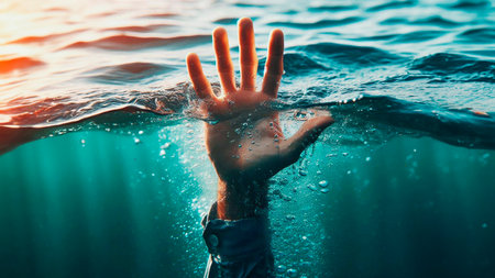 AI Generated. Person fights to keep their head above water as a hand emerges from the ocean
