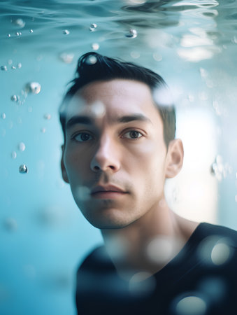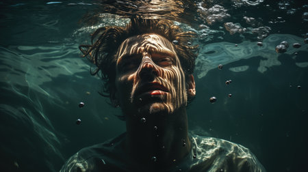 Man is submerged in the water with bubbles of water on his face. Generative AI.