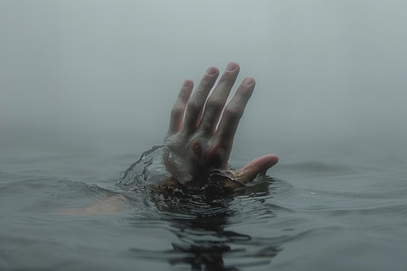 Human hand drowning in the water on a foggy day with copy space