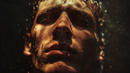 Portrait of a young man in a shower with water drops.