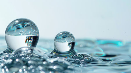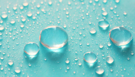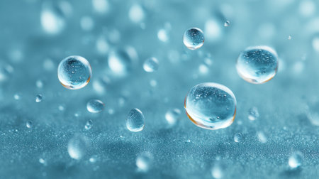 a close-up view of numerous water droplets scattered across a smooth, vibrant blue surface. The droplets vary in size, with some larger ones prominently displaying spherical shapes and clear reflections of light. The background is a soft gradient of cyan and teal, creating a sense of depth and tranquility. The lighting highlights the transparency and purity of the water, emphasizing its refreshing and clean qualities. The overall impression is one of natural beauty and simple elegance,...