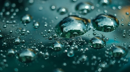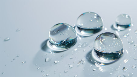 Translucent water droplets on smooth surface with subtle color gradient. That the image is generated using AI.