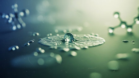 This stunning image captures a close-up view of a water droplet showcasing an intricate molecular structure with red and blue elements, evoking innovation in scientific concepts.