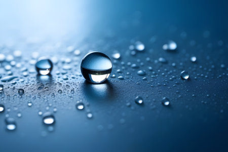 This macro captures numerous water droplets of varying sizes scattered across a smooth, gradient blue surface. The droplets are perfectly spherical, showcasing their transparency and the way they refract and reflect light, creating small, bright highlights. Some larger droplets in the foreground are so clear they reveal the blue surface beneath them, while smaller ones appear as tiny, shimmering beads. The background exhibits a soft bokeh effect, with out-of-focus light creating a dreamy and...