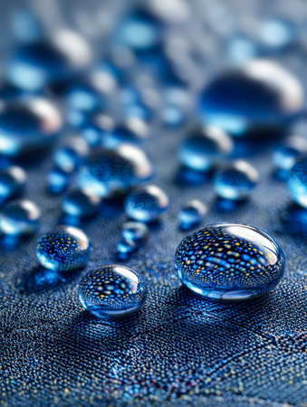 An extreme close-up, macro showcasing a multitude of clear water droplets scattered across a textured blue surface. The droplets vary in size, with some exhibiting internal bubbles and clear reflections of their surroundings. The focus is sharp on the foreground droplets, with a shallow depth of field blurring the background. The highlights the intricate beauty of water in its liquid form.