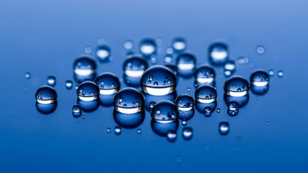 Macro photo of shimmering water droplets, focused and blurred, against a deep blue background