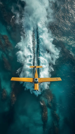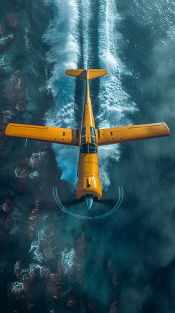 Aerial view of a small yellow airplane in the sea. 3d rendering