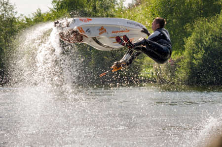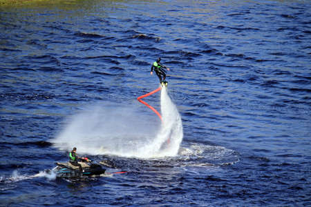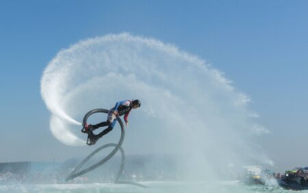 Russia Zhukovsky August 30, 2019 flyboarders show at the air show max 2019 photo taken in the summer on a sunny day