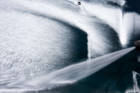 An aerial perspective showcases a boat speeding through turquoise water, leaving foamy white trails. The composition features contrasting colors and textures, capturing the motion and energy of the vessel. This image is suitable for various commercial uses, including advertising, travel, and environmental themes.