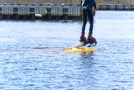 man having fun on Flyboard. Flyboarding in a sunny summer day at river in harbor. Extrime water activity flyboard.