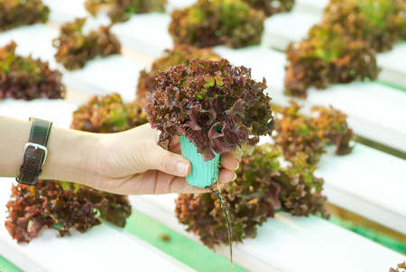 Farmer picking hydroponic red oak up in plant nursery farm. organic salad vegetable.