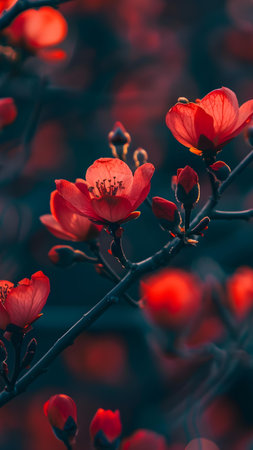 Fabulously beautiful flowers on a tree branch. Crimson flowers.