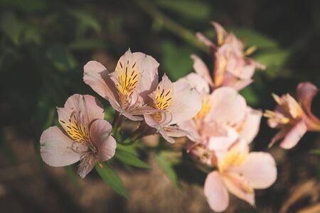 view of charming spring flowers, blooming variegated flowers, colorful spring flowers, petal fragments on a blurred background, selective focus.