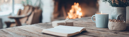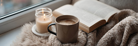 Comfortable winter scene with coffee mug, book, blanket, candle, and pinecone decorations