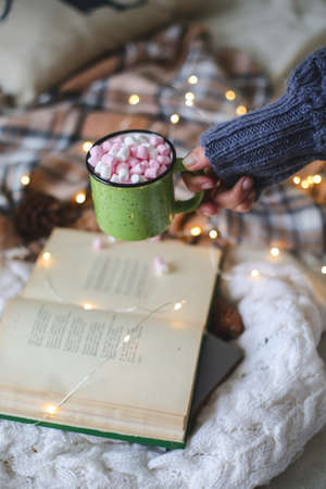 Cup of hot cocoa with marshmallow, book, eyeglasses, knitted scarf and Christmas lights. Cozy winter atmosphere