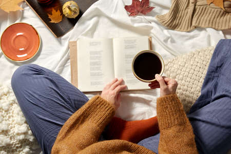 Cozy autumn at home, a woman with tea and a book resting. A cozy way of life. Body parts in the composition.
