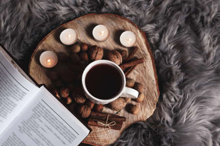 A cup of tea drink on a decorated wooden log with an opened book and candles burning. Wintertime and drink concept