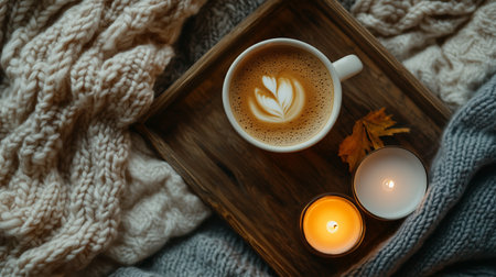 Cozy autumn morning with coffee, candles, and knit blankets on a wooden tray