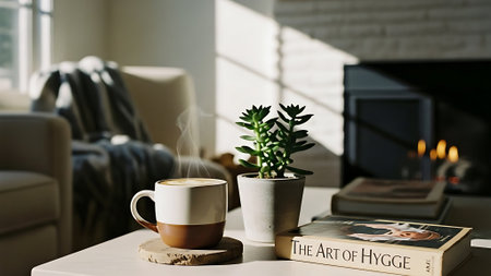 A cozy living room scene featuring a knitted blanket on a sofa, a wooden coffee table with a steaming cup, and a small vase with a pine sprig, sunlight streaming through a window