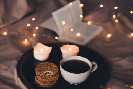 Cup of fresh black tea with stack of biscuits with chocolate filling on tray with burning candles and open paper book in bed over glow lights. Cozy home atmosphere.