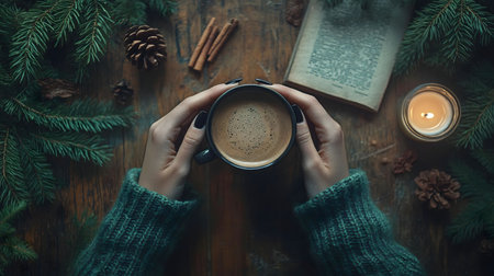 Woman's hands holding a warm cup of coffee, surrounded by cozy winter elements. Perfect for holidays.