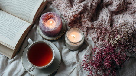 Cup of tea, book, candles and flowers on the bed. Cozy home atmosphere.