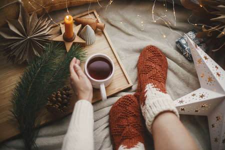 Woman feet in woolen socks on soft bed with warm cup of tea, christmas stars, golden lights, trees, candle and pillows. Cozy winter moments at home. Girl relaxing in scandinavian evening room