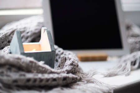 Cozy home interior with a laptop, a cup of coffee and a book on the windowsill