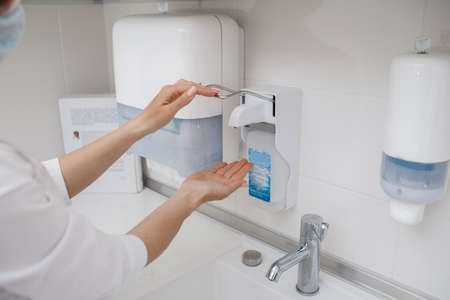 Woman taking foam soap from a containter to wash hands. Hygiene, preventing coronavirus and healthcare
