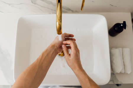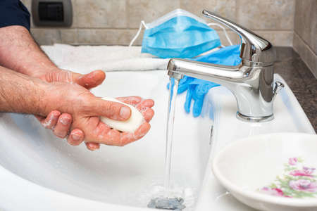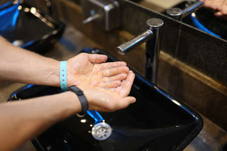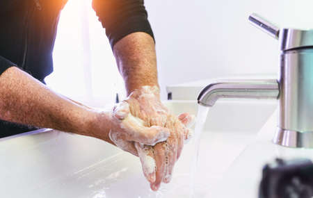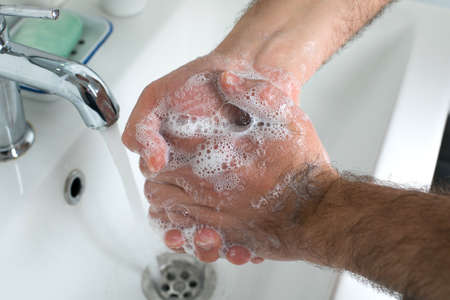 Man washing his hands with soap. Coronavirus transmitted through a hands.