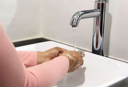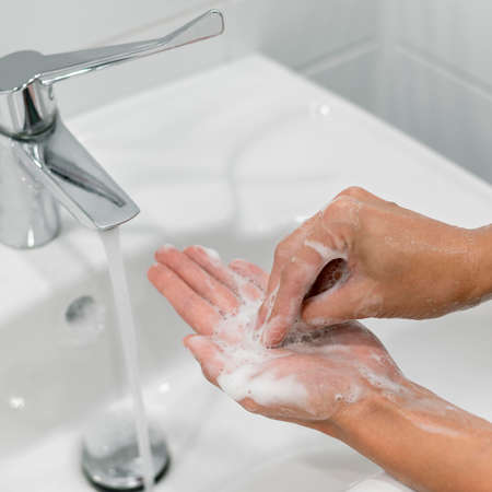 Woman use soap and washing hands under the water tap. Hygiene concept hand detail