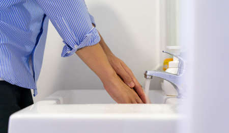 Washing hands at home in bathroom. Healthy lifestyle, hygiene and prevention viral and bacterial diseases.