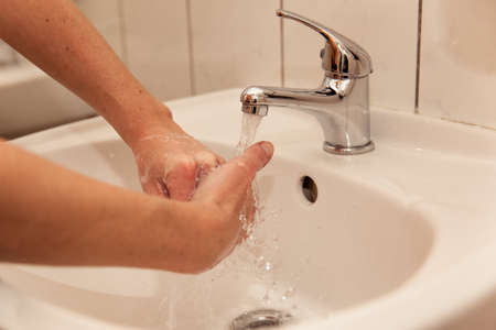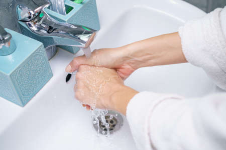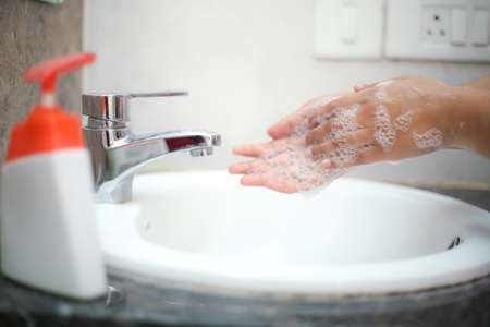 Washing hands with soap and hot water at home bathroom sink women cleansing hand hygiene for coronavirus outbreak prevention. Corona Virus pandemic protection by washing hands frequently.
