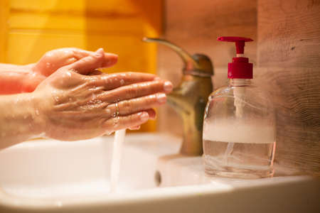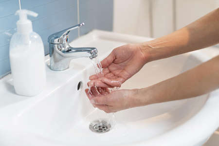 Women use liquid soap for rubbing and washing her hands under the water tap. Hygiene concept. Wash hands to stop spreading coronavirus.